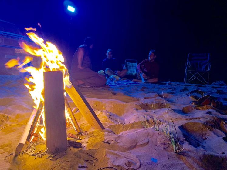 We had a BBQ that evening in the desert with some of Abdul’s pals, after driving a short way across the dunes. The chaps rigged a light up to the car battery and we rolled out a mat on a hill top. Another of their mates came to join us, and we watched his car lights turn off from the motorway about a mile away and then slowly make its way towards us. Driving over the dunes, following a Whatsapp location at first and then our bright light. He had a desert ready 4×4 that didn’t need roads.