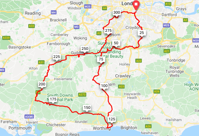 From Petersfield you leave the SDW and follow Shipwright’s Way back north on a mixture of road and tracks. Eventually you re-join the NDW near Farnham and follow this back past Guilford. From there, the route is a mixture of paths through the commons SW of London, concluding with sections through along the Kingston, Wimbledon and Putney before finishing at the Thames in Wandsworth.