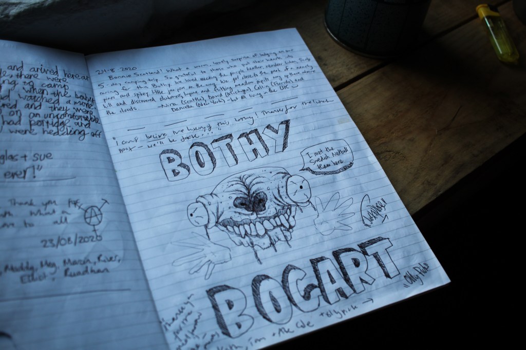 That evening I reached Ruigh Aiteachain bothy which, for the record, I definitely shouldn’t have stayed in. I confess it hadn’t occurred to me that the bothies would be closed due to COVID-19, and this one was both unlocked and empty. The bothy book had regular semi-regular entries all through summer, so I made myself at home.