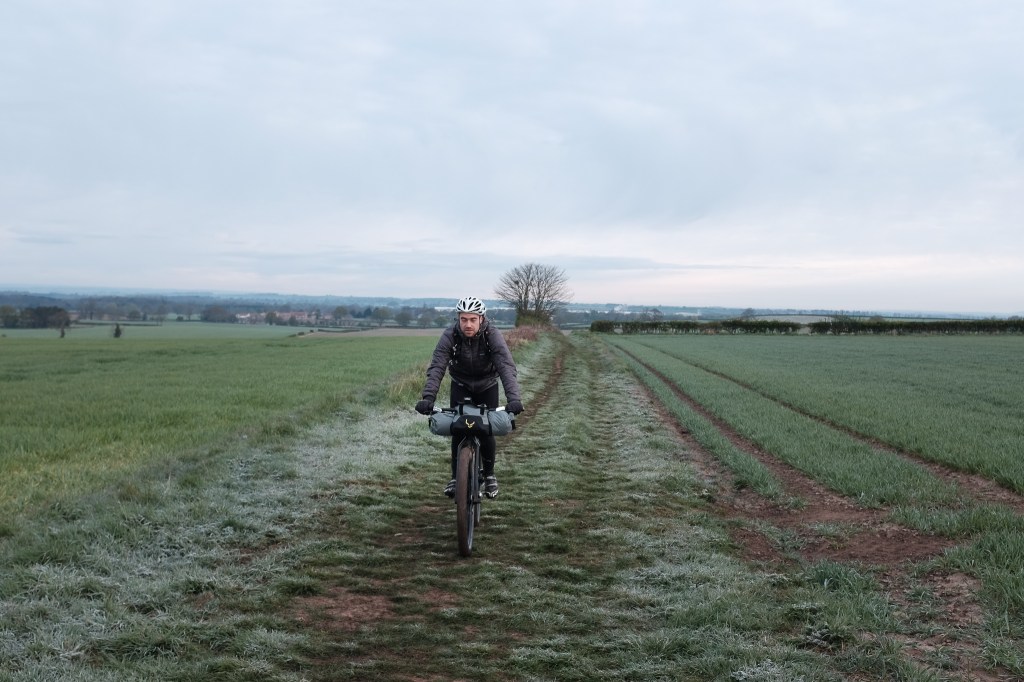 It was still raining in the morning, a truly foul way to start the day. The weather was bonkers – there was even sleet and hail falling horizontal in the wind. We were, of course, heading straight into the wind and walking across flat fields. We simply couldn’t ride it.